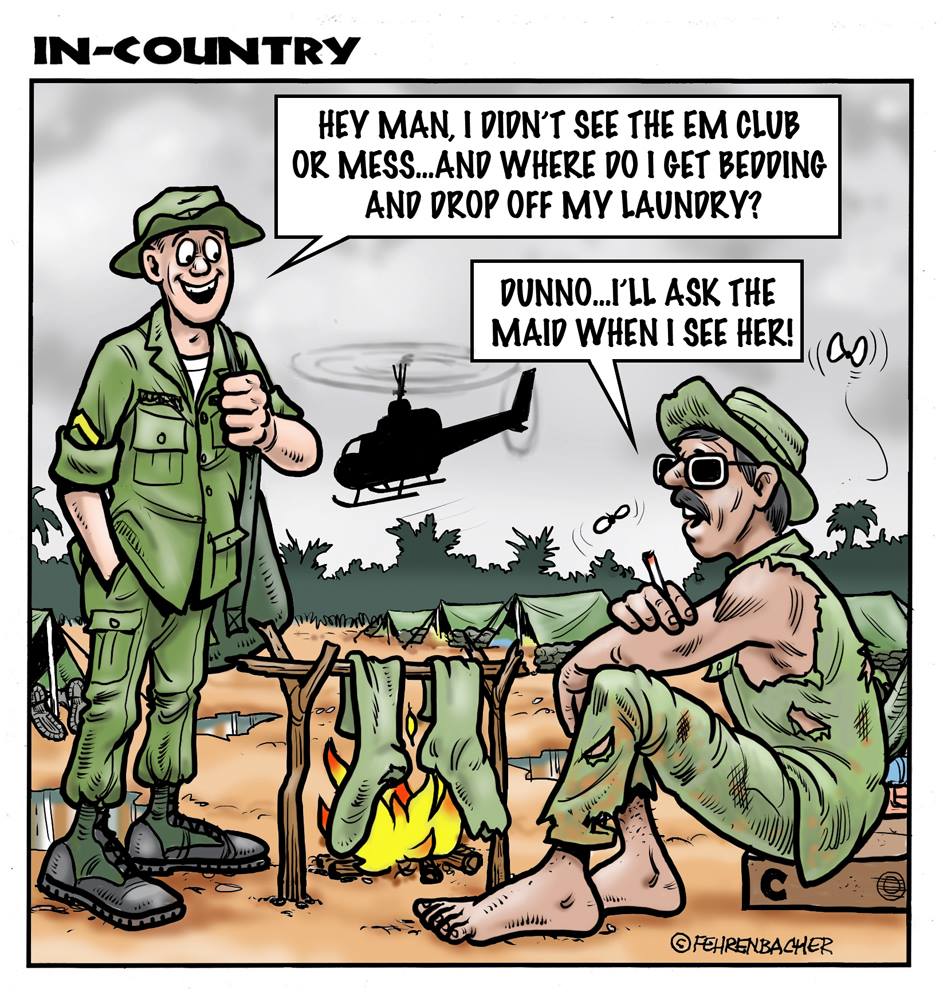 Phil enlisted in the Army in 1965 where you served for years in Vietnam. He became a graphic designer and has worked for the state of Oregon for 26 years. He retired in 2003 and started the Cartoon "In-Country". The cartoons reflect his experiences during his tour of duty in South Vietnam.